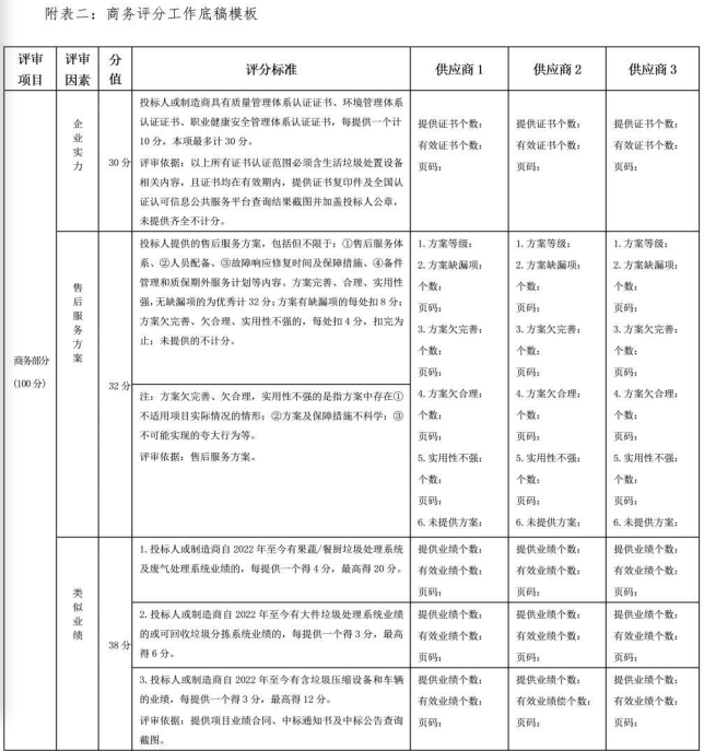 采购人在编写好某采购项目的商务评分细则后,根据商务评分细则再编写一份商务评分工作底稿模板(详见附表二)。评审委员会成员对符合条件的供应商进行评分时,根据供应商提交的响应文件逐项审查,将找到的依据填写在评分工作底稿模板对应空白处,从而形成评分工作底稿。评审专家根据评分工作底稿记录的打分依据进行打分。