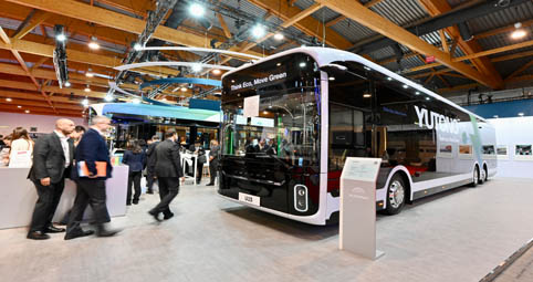 日前,两年一届的世界客车博览会在比利时首都布鲁塞尔开幕。来自中国的80余家参展企业亮相,集中展示绿色出行的“中国方案”。图为在世界客车博览会上,参观者经过展出的宇通智能高端纯电公交车U15。