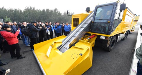 北京从11月进入2025—2026年度扫雪铲冰季。北京市城市管理委员会近日在朝阳区举行扫雪铲冰演练,移动融雪车首次亮相,将在今冬展开试点应用。目前,北京各区、各作业单位已配备多功能除雪车、融雪洒水车、洗扫车等车辆设备1.1万余台套,基本满足作业需要。图为展示的移动融雪车。