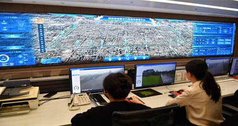 西安城墙是我国现存历史最悠久、规模最宏大、保存最完整的古代城垣建筑之一。如今,文物保护人员利用无损检测技术对古城墙内部做的“全身CT扫描”,以及在人工巡查时对城墙的裂缝和位移等数据的测量,连同多年积累下来的修缮数据和游客运营等信息,都和城墙数字孪生系统一起,被一个“超级大脑”分析和管理着,这个“超级大脑”就是“西安城墙数字方舱综合管理平台”。图为工作人员通过“西安城墙数字方舱综合管理平台”开展工作。